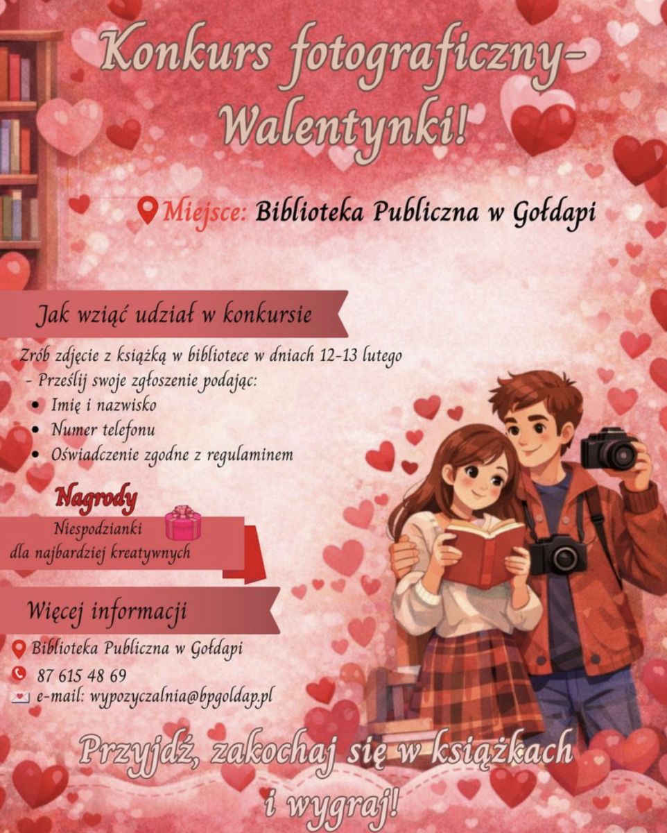 Walentynki to co roczne święto zakochanych, które przypada 14 lutego z tej okazji Biblioteka Publiczna  w Gołdapi  zaprasza do udziału w konkursie fotograficznym pod hasłem: „Randka z książką”.